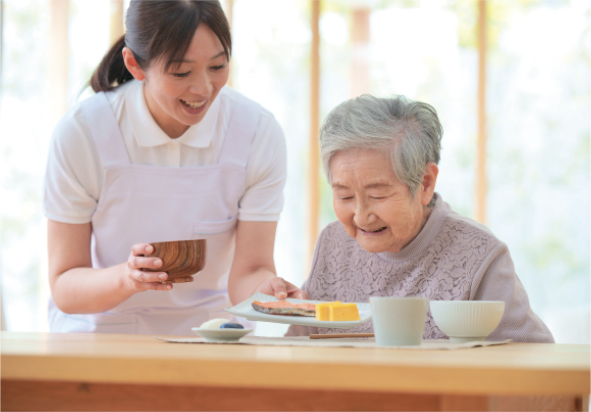 私たちは、⼊居者様・ご家族様・地域の⽅々・スタッフの幸せのため、何をすべきか、何ができるかを考え⾏動すること、これを原点に介護事業に取り組んでいます。
