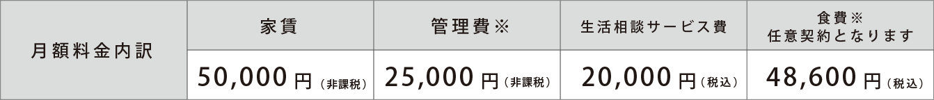 介護保険・医療保険・日用品・衛生用品などは自己負担になります。 敷金100,000円(非課税)・火災保険料 |